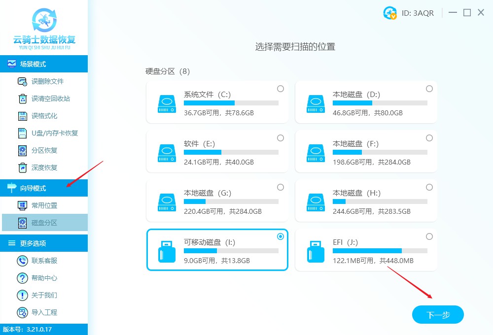 打开软件操作界面,将三星内存卡通过读卡器插入电脑中,打开软件操作界面,选择向导模式,选择需要恢复的磁盘分区,点击下一步。
