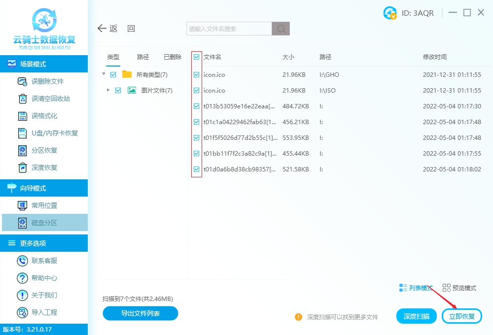 扫描完成后,把需要恢复的照片文件勾选上,再点击右下角底部立即恢复按钮,把数据另存为到其他的磁盘即可。