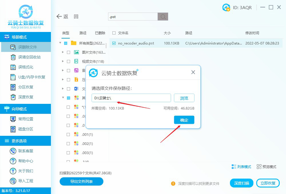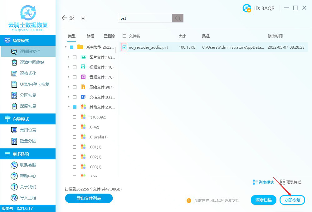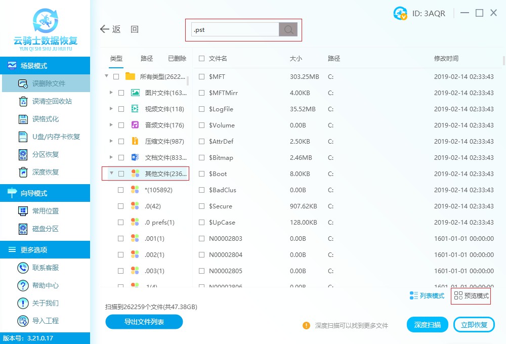 云骑士数据恢复软件作为一款能够恢复pst文件的工具,支持免费扫描和预览丢失的pst文件,支持恢复误格式化、误删除、误分区等原因导致的pst文件丢失,软件支持硬盘、U盘、内存卡、摄像机,行车记录仪等各种设备。操作简单易懂,可根据数据丢失情况,选择一个合适的模式进行恢复。