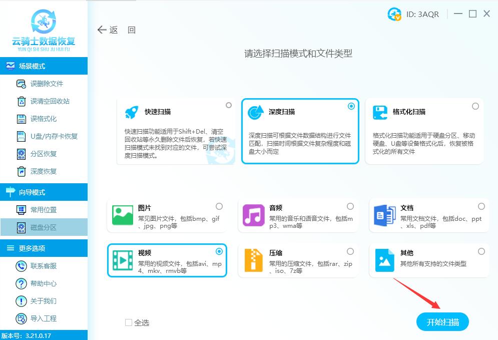 根据需要选择扫描模式和文件类型,点击开始扫描按钮。