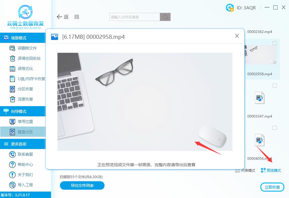 根据文件类型找到所需mp4视频,也可以点击右下角的预览模式预览文件(支持预览mp4视频文件的第一帧画面,完整内容需导出后查看)。