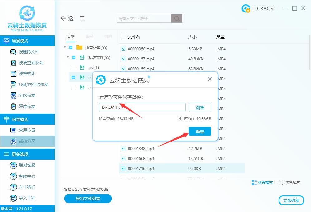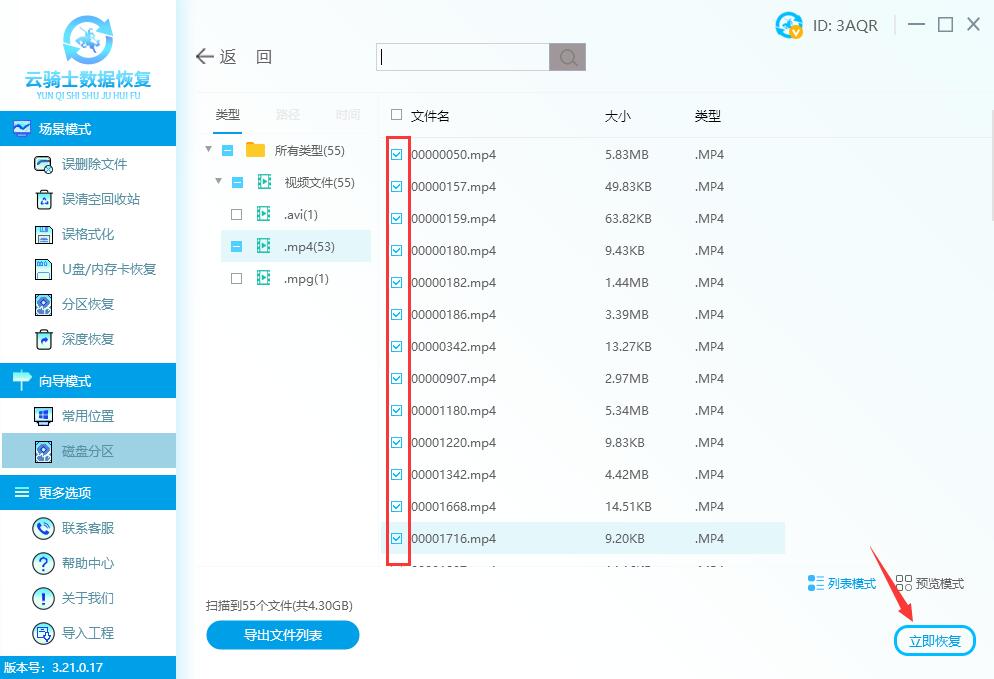 勾选好需要的mp4视频后点击右下角的立即恢复按钮。